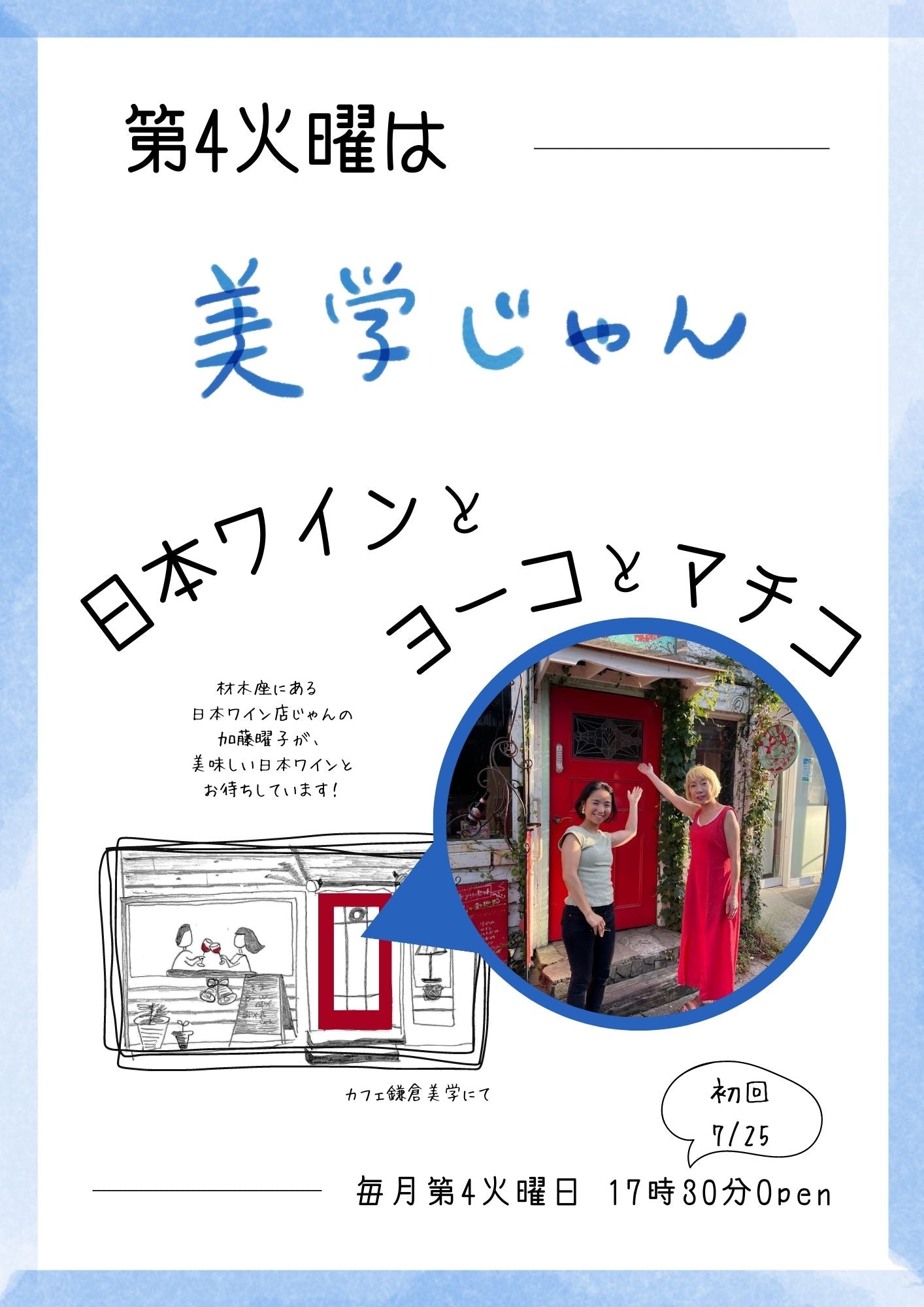 鎌倉駅西口を降りてスグの「カフェ鎌倉美学」を、毎月第4火曜日にお借りして日本ワインを提供させて頂けることになりました。その名も"美学じゃん"です。初回を終えて、カフェ鎌倉美学のオーナー、マチコさんの懐の深さを改めて実感しました。