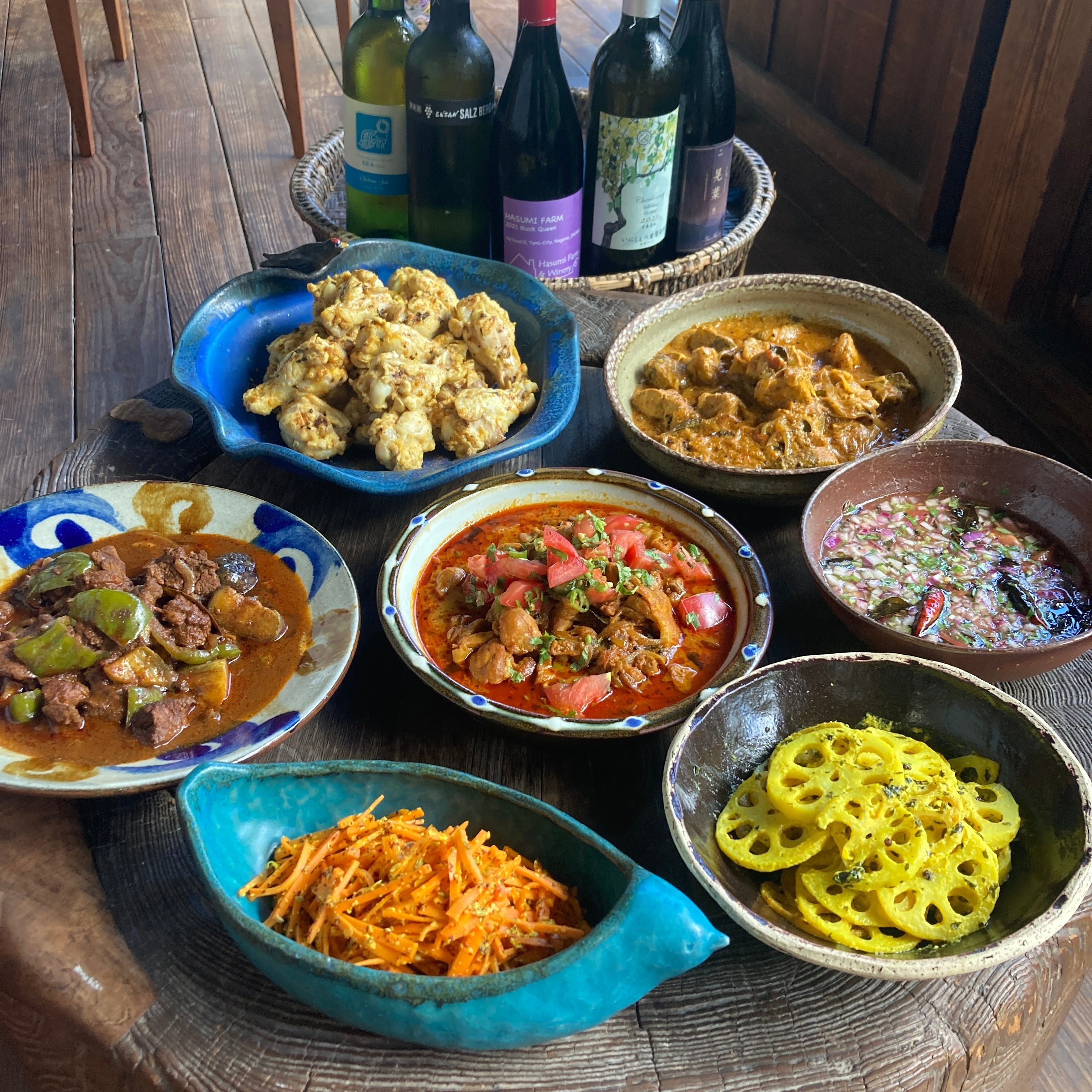 スパイスつまみは、インドの東西南北の地方別に、おつまみプレートが4種類。これまで学んだ事を総結集して、それぞれに合うワインを当店から提供しました。