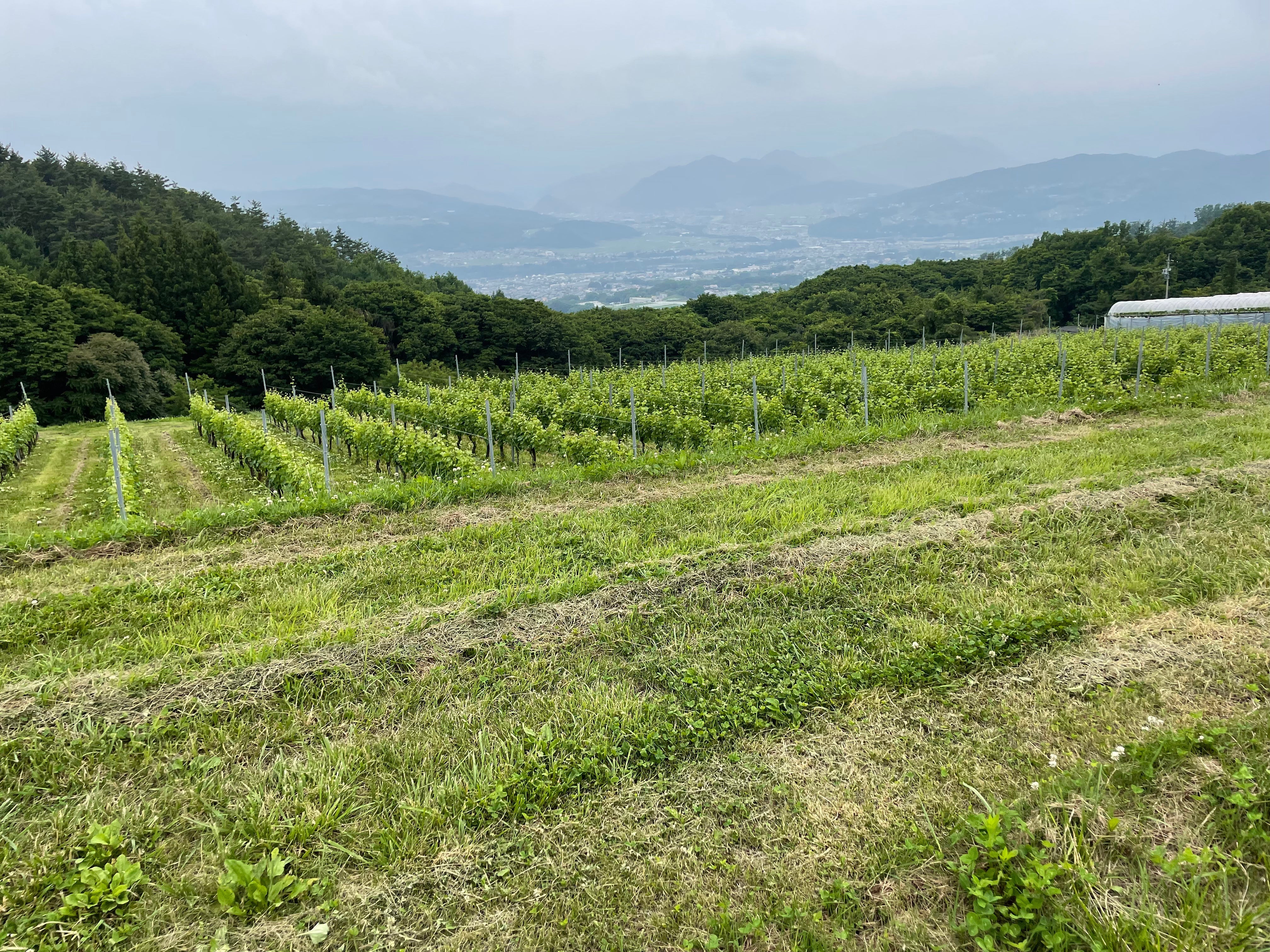 ↑東信エリア、千曲川右岸にあるヴィラデストワイナリーのブドウ畑。千曲川沿いの佐久盆地と、遠くに北アルプスを一望できる。