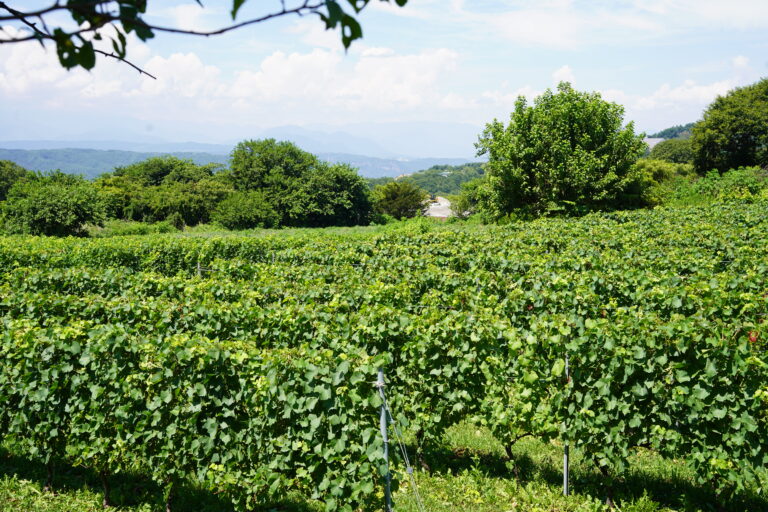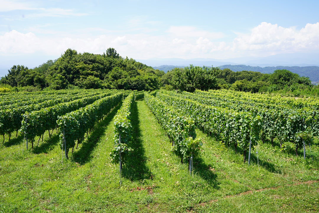 細い農道を抜けると突然視界が開け、静寂に包まれたブドウ畑が広がります。標高の高いこの地からは八ヶ岳や浅間山を望む絶景が広がり、時折吹き抜ける風にブドウの葉が揺れる様子がなんとも心地よい空間でした。