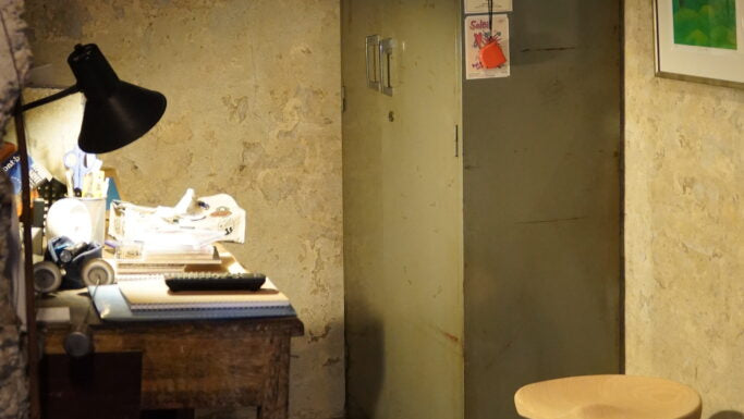 醸造所内にはかつての貯蔵用コンクリートタンクを改装して3畳ほどの事務室として使用しており、アンティークな木の机や椅子、さりげなく飾られた絵などが置かれています。