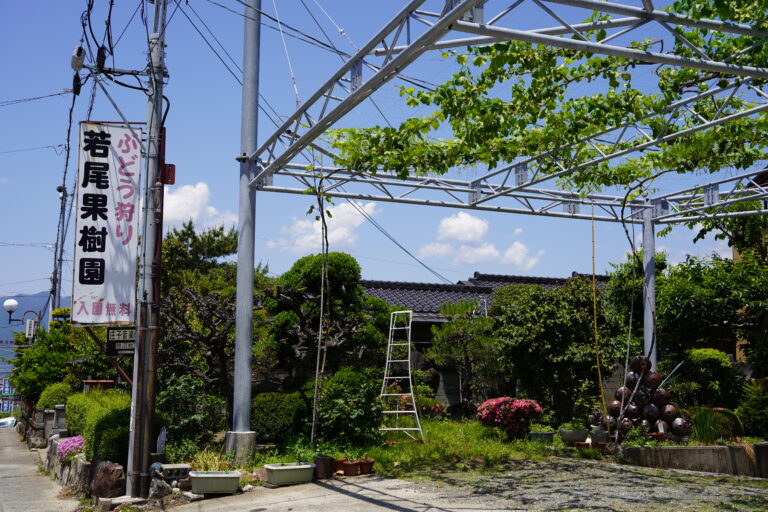 通りには「若尾果樹園」の看板が立ち、今もブドウ園として果物狩りを楽しめる姿が残っています。
