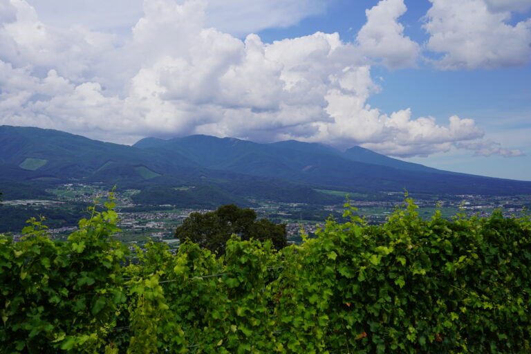 長野県上田市の山道を登った先に広がるトゥモローワインのブドウ畑。標高650メートルのこの場所からは、千曲川を挟んで上田市と東御市の美しい景色が一望できます。